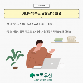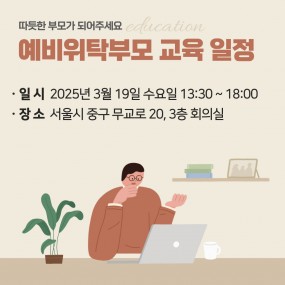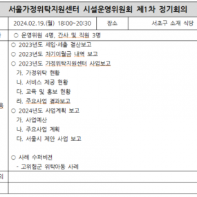 게시판 제목내용제목+내용 961 2025년 서울시 NEW 슬로건 공모전 (마감) 슬로건 제출: 이메일 제출 / sefoster@chil.. 2025-04-02 960 2025년 4월 예비위탁부모 양성교육 안내 ※ 콘텐츠 제작: 랜선 서포터즈 2기 김준형 2025-04-02 959 2024년도 서울특별시가정위탁지원센터 세입, 세출결산서(후원금품 포함) 공고 공 고 2024년도 서울특별시가정위탁지원센터 세입, .. 2025-04-01 958 2025년 신규프로그램 안내(C.Q.)_자립준비청년 지원 프로그램 ※ 콘텐츠 제작: 랜선 서포터즈 2기 유동선 2025-03-17 957 [서울특별시가정위탁지원센터] 최종합격자 안내(대체계약직) 서울특별시가정위탁지원센터에서는 복지사업 전문인력 대체계약직에 대한최종합격.. 2025-03-13 956 2025년 3월 예비위탁부모 양성교육 안내 ※ 콘텐츠 제작: 랜선 서포터즈 2기 김준형 2025-03-11 955 2025 상반기 학업유지비(대학진학자), 취업준비금(대학졸업예정자 및 미진학자) 신청 안내(~3/27) 2025 상반기 학업유지비, 취업준비금 신청 안내서울시에서 대학.. 2025-03-11 954 [서울특별시가정위탁지원센터] 면접전형 합격자 안내(대체계약직) * 면접전형 합격자 안내 - 면접합격자: 황0원&nb.. 2025-03-06 953 [서울특별시가정위탁지원센터] 서류 합격자 발표 및 면접 일정 안내(대체계약직) * 서류전형합격자 면접 일정 안내 1. 면접일.. 2025-02-28 952 서울특별시 경계선지능인 평생교육 지원센터 - 아동청소년, 청년 참여자모집 1.센터 소개 영상 https://bit.ly/introduce.. 2025-02-19 951 어린이재단 서울특별시가정위탁지원센터 계약직 채용 공고 어린이재단 서울특별시가정위탁지원센터 계약직 채용 공고 .. 2025-02-14 950 입사지원서 양식 첨부 파일 다운로드: 입사지원서(양식).xlsx 2025-02-10 949 [예산 마감 임박] 2025년 배움마켓 사업 안내 홈페이지 링크: https://www.learn-sjarip.o.. 2025-02-10 948 2025년 2월 예비위탁부모 양성교육 안내 2025-02-03 947 2024년 시설 운영위원회 회의록 게시 ※ 서울가정위탁지원센터에서는 2024년 시설 운영위원회 회의록을 게시합니.. 2025-01-07 946 2025년도 세입, 세출명세서 및 2024년도 2차 추경 예산 공고 공 고2025년도 서울특별시가정위탁지원센터 세입, 세출명세서 및 2024.. 2025-01-07 처음 1페이지 2페이지 3페이지 4페이지 열린5페이지 6페이지 7페이지 8페이지 9페이지 10페이지 다음 맨끝