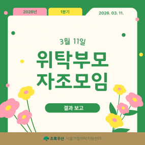 게시판 제목내용제목+내용 0 공지 ★2026년 상반기 학업유지비, 취업준비금 신청안내(~3/24) 2026년 상반기 학업유지비, 취업준비금 지원사업 신청안내서울시에서 대학.. 2026-03-09 1028 2026년 1분기 위탁부모 자조모임 진행 ※ 콘텐츠 제작: 랜선 서포터즈 3기 이현지 2026-03-17 1027 봄에 하기 좋은 활동 모아보기 ※ 콘텐츠 제작: 랜선 서포터즈 3기 최다희 2026-03-13 1026 2026년 3월 예비위탁부모 양성교육 안내 2026-03-04 1025 내 아이 키울때 이런 순간, 기억하시나요? ※ 콘텐츠 제작: 랜선 서포터즈 2기 정윤지 2026-02-10 1024 [서울특별시가정위탁지원센터] 대체계약직 최종합격자 안내 서울특별시가정위탁지원센터에서는 복지사업 전문인력 대체계약직에 대한최종합격.. 2026-01-29 1023 2026 상반기 CJ도너스캠프 아카데미 (~3/2까지) 본 교육과정은 CJ나눔재단에서 운영하는 청년들을 위한 사회공헌.. 2026-01-29 1022 2026년 2월 예비위탁부모 양성교육 안내 2026-01-26 1021 아름다운 함께서기 '자립준비청년 인턴십' 참여자 모집 (~2/1까지) 2026-01-26 1020 [서울특별시가정위탁지원센터] 서류 합격자 발표 및 면접 일정 안내(대체계약직) * 서류전형합격자 면접 일정 안내 1. 면접일.. 2026-01-21 1019 어린이재단 서울특별시가정위탁지원센터 계약직 채용 공고 어린이재단 서울특별시가정위탁지원센터 계약직 채용 공고 서울특별시.. 2026-01-09 1018 2025년 시설 운영위원회 회의록 게시 ※ 서울가정위탁지원센터에서는 2025년 시설 운영위원회 회의록을 게시합니.. 2026-01-08 1017 2026년도 세입, 세출명세서 및 2025년도 2차 추경 예산 공고 공 고2026년도 서울특별시가정위탁지원센터 세입, 세출명세서 및 2025.. 2026-01-07 1016 2026년 1월 예비위탁부모 양성교육 안내 2026-01-05 1015 「2026_U.D.A.N_자립준비청년_인재_지원사업」 5기 대상자 모집 (1/31까지) 2026-01-05 1014 2025년 이슈 몰아보기 ※ 콘텐츠 제작: 랜선 서포터즈 2기 신세희 2025-12-31 열린1페이지 2페이지 3페이지 4페이지 5페이지 6페이지 7페이지 8페이지 9페이지 10페이지 다음 맨끝