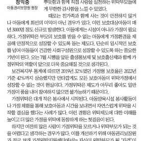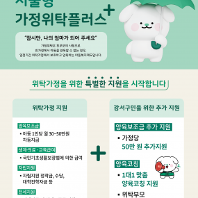게시판 제목내용제목+내용 948 2025년 2월 예비위탁부모 양성교육 안내 2025-02-03 947 2024년 시설 운영위원회 회의록 게시 ※ 서울가정위탁지원센터에서는 2024년 시설 운영위원회 회의록을 게시합니.. 2025-01-07 946 2025년도 세입, 세출명세서 및 2024년도 2차 추경 예산 공고 공 고2025년도 서울특별시가정위탁지원센터 세입, 세출명세서 및 2024.. 2025-01-07 945 초록우산, 서울 3개 자치구 비혈연 위탁가정 양육 지원 강화 초록우산, 서울 3개 자치구 비혈연&.. 2024-11-13 944 2024 하반기 학업유지비(대학진학자), 취업준비금(대학졸업예정자 및 미진학자) 신청 안내(~9/19) 2024 하반기 학업유지비, 취업준비금 신청 안내서울시에서 대학.. 2024-09-09 943 초록우산-동작구, '2024 서울형 가정위탁플러스'로 가정위탁 지원 강화 ▲업무협약 모습[사진=초록우산] 아동복지전문기관 초록우.. 2024-08-26 942 [센터소식] 홀트아동복지회-서울가정위탁지원센터와 업무협약 초록우산, 홀트아동복지회와 가정형 아동보호 강화 협력- 초록우산, 홀트아.. 2024-07-15 941 보건복지부 2024년 전국민 마음투자 지원사업 안내 <보건복지부 2024년 전국민 마음투자 지원사업 안내>1. 보.. 2024-07-01 940 [센터소식] 에듀래더-서울가정위탁지원센터와 업무협약 초록우산-에듀래더, 가정위탁 아동 자립 돕는다 - 초록우산 서울가.. 2024-06-13 939 [언론보도] "나 잊으면 안돼" 키워준 할머니가 치매에 걸렸다[2024.06.05 유튜브 송출) 외조부모님과 함께 생활하는 위탁가정 이야기가 <.. 2024-06-10 938 2024년 1차 추경예산 공고 공 고 2024년 1차 추경예산 공고 우리 센터에서는 .. 2024-06-05 937 [언론보도] 모든 아동은 가정이 필요하다(2024.05.30.보도) ▲기고문 위탁아동을 위한 아동권리보장원 정익중 원장의.. 2024-05-30 936 [언론보도] 前 봅슬레이 국가대표 강한, 초록우산에 인세 기부(2024.05.23.보도) ▲기사 사진 위탁아동을 위한 따뜻한 기부 소식이 &l.. 2024-05-24 935 2024 강서 아이들 까치까치 페스티벌 <서울형 가정위탁플러스(강서) 캠페인> 진행합니다! <서울형 가정위탁플러스(강서) 캠페인>- 행사명 :.. 2024-05-24 934 2024년 일반위탁부모 온라인 보수교육 이수방법 안내 안녕하세요, 서울가정위탁지원센터입니다.가정위탁지원센터에서는 매년 1회 위.. 2024-05-17 933 [언론보도] 꽁꽁 얼어붙은 세상 위로 하나님의 사랑이 지나갑니다.(2024.05.07.~05.12. 방영) ▲CBS 새롭게하소서 유튜브 썸네일 네이슨(가명)과 이든(가명).. 2024-05-16 처음 1페이지 2페이지 3페이지 4페이지 5페이지 열린6페이지 7페이지 8페이지 9페이지 10페이지 다음 맨끝