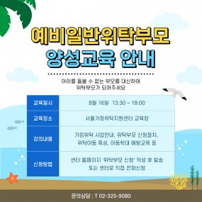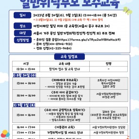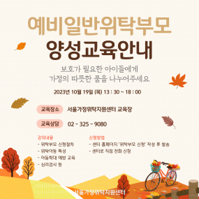 게시판 제목내용제목+내용 913 '나를 디깅(Digging)해' 캠프 실시 (신청기한: ~10/23) 서울시아동자립지원사업단에서는배움마켓 특화과정 - 자립준비청년의 .. 2023-10-19 912 일반위탁부모 보수교육(8차) 2023-10-18 911 2분기 일반위탁부모 자조모임 2023-10-18 910 SK 행복나눔재단 보호대상 청소년 진로 지원 프로그램 (신청기간: ~10/15) <보호대상 청소년 진로 지원 프로젝트 (Base.오롯)>* B.. 2023-10-04 909 2023년 10월 예비일반위탁부모 양성교육 안내 서울가정위탁지원센터에서는 10월 19일(목)에 예비일반위탁부모 양성교육을.. 2023-09-27 908 청년 전세보증금반환보증 보증료 지원사업(최대 30만원 지원) 2023-09-22 907 코리아교육그룹 교육나눔 장학사업 (매월 3명 선발) 2023-09-13 906 2023 하반기 대학진학자 학업유지비 및 취업준비금 신청 안내(1차 신청기한 ~9/15) 2023 하반기 대학진학자 학업유지비 및 취업준비금 신청 안내".. 2023-09-06 905 자립준비청년 식재료 꾸러미 지원 사업 신청 안내 (신청기간: 9/1~9/15) 2023-09-05 904 2023년 9월 예비일반위탁부모 양성교육 안내 서울가정위탁지원센터에서는 9월 19일(화)에 예비일반위탁부모 양성교육을 .. 2023-08-24 903 일반위탁부모 보수교육(5,6,7차) 2023-08-18 902 skyLife 자립준비청소년 자격증 장학사업 (신청기간: 8/14~9/10) 2023-08-18 901 2023년 일반위탁부모 오프라인 보수교육(8/30,9/2) 안내 안녕하세요, 서울가정위탁지원센터입니다.가정위탁부모라면 매년 5시간 이상 .. 2023-08-18 900 2023 함께하는 자립기술교육 '자립말고 동(同)립' 안내 안녕하세요, 서울가정위탁지원센터에서는 2023 함께하는 자립기술교육&nb.. 2023-08-09 899 내가 만들고 내가 디자인하는 자립 서비스&프로그램 디자인 워크숍 안내 안녕하세요, 서울가정위탁지원센터입니다.여러분을 '내가 만들고 내가 디자인.. 2023-08-03 898 [공지] 2023년 8월 예비일반위탁부모 양성교육 안내 서울가정위탁지원센터에서는 8월 16일(수)에 예비일반위탁부모 .. 2023-07-28 처음 1페이지 2페이지 3페이지 4페이지 5페이지 6페이지 7페이지 열린8페이지 9페이지 10페이지 다음 맨끝