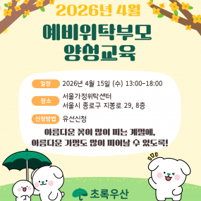게시판 제목내용제목+내용 0 공지 2026년 4월 예비위탁부모 양성교육 안내 ※ 콘텐츠 제작: 랜선 서포터즈 3기 김아리 2026-04-03 1030 우리가 알아야 할 아동권리 ※ 콘텐츠 제작: 랜선 서포터즈 3기 김태린 2026-03-24 1029 2026년 1분기 위탁부모 자조모임 진행 ※ 콘텐츠 제작: 랜선 서포터즈 3기 이현지 2026-03-17 1028 봄에 하기 좋은 활동 모아보기 ※ 콘텐츠 제작: 랜선 서포터즈 3기 최다희 2026-03-13 1027 ★2026년 상반기 학업유지비, 취업준비금 신청안내(~3/24) 2026년 상반기 학업유지비, 취업준비금 지원사업 신청안내서울시에서 대학.. 2026-03-09 1026 2026년 3월 예비위탁부모 양성교육 안내 2026-03-04 1025 내 아이 키울때 이런 순간, 기억하시나요? ※ 콘텐츠 제작: 랜선 서포터즈 2기 정윤지 2026-02-10 1024 [서울특별시가정위탁지원센터] 대체계약직 최종합격자 안내 서울특별시가정위탁지원센터에서는 복지사업 전문인력 대체계약직에 대한최종합격.. 2026-01-29 1023 2026 상반기 CJ도너스캠프 아카데미 (~3/2까지) 본 교육과정은 CJ나눔재단에서 운영하는 청년들을 위한 사회공헌.. 2026-01-29 1022 2026년 2월 예비위탁부모 양성교육 안내 2026-01-26 1021 아름다운 함께서기 '자립준비청년 인턴십' 참여자 모집 (~2/1까지) 2026-01-26 1020 [서울특별시가정위탁지원센터] 서류 합격자 발표 및 면접 일정 안내(대체계약직) * 서류전형합격자 면접 일정 안내 1. 면접일.. 2026-01-21 1019 어린이재단 서울특별시가정위탁지원센터 계약직 채용 공고 어린이재단 서울특별시가정위탁지원센터 계약직 채용 공고 서울특별시.. 2026-01-09 1018 2025년 시설 운영위원회 회의록 게시 ※ 서울가정위탁지원센터에서는 2025년 시설 운영위원회 회의록을 게시합니.. 2026-01-08 1017 2026년도 세입, 세출명세서 및 2025년도 2차 추경 예산 공고 공 고2026년도 서울특별시가정위탁지원센터 세입, 세출명세서 및 2025.. 2026-01-07 1016 2026년 1월 예비위탁부모 양성교육 안내 2026-01-05 열린1페이지 2페이지 3페이지 4페이지 5페이지 6페이지 7페이지 8페이지 9페이지 10페이지 다음 맨끝