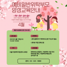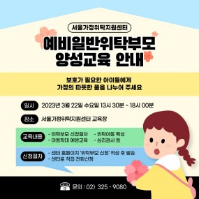 게시판 제목내용제목+내용 881 2023년 서울가정위탁지원센터 스토리 공모전 개최(4/17~5/7) l 공모주제: 우리가족의 행복한&n.. 2023-04-14 880 2023년 4월 예비일반위탁부모 양성교육 안내 * 콘텐츠 제작: 랜선 서포터즈(고나영, 김다연) 2023-04-05 879 [예결산] 2022년 세입,세출 결산(후원금품 포함) 및 사용결과보고서 우리 센터에서는 사회복지법인 및 사회복지시설 재무회계규칙 제19조(결산서.. 2023-03-31 878 임상심리치료 전문인력 육아휴직대체계약직 최종합격자 안내 서울가정위탁지원센터에서는 임상심리치료 전문인력 육아휴직대체계약.. 2023-03-30 877 서울청년문화패스 신청안내(4월 19일 ~ 4월 30일) 2023-03-29 876 임상심리치료 전문인력 육아휴직대체계약직 면접전형 합격자 안내 서울가정위탁지원센터에서는 임상심리치료 전문인력 육아휴직대체계약직에 대한&.. 2023-03-22 875 임상심리치료 전문인력 육아휴직대체계약직 면접대상자 안내 서울가정위탁지원센터에서는 임상심리치료 전문인력 육아휴직대체계약직에 대한면.. 2023-03-17 874 임상심리치료 전문인력 육아휴직대체계약직 서류전형 합격자 안내 서울가정위탁지원센터에서는 임상심리치료 전문인력 육아휴직대체계약직에 대한 .. 2023-03-13 873 자립준비 청소년을 위한 내가 그린(green) 멘토링 멘토 모집 서울가정위탁지원센터에서는 2023년 가정위탁 청소년을 위한 멘.. 2023-03-08 872 2023년 3월 예비일반위탁부모 양성교육 안내 * 콘텐츠 제작: 랜선 서포터즈(고나영, 김다연) 2023-03-06 871 2023년 서울가정위탁지원센터 자립챌린저스 합격자 발표 2023-03-06 870 서울시가정위탁지원센터 임상심리치료 전문인력 육아휴직 대체계약직 채용공고 서울특별시가정위탁지원센터에서는 어린이들이 행복한 세상을 만드는 일에 .. 2023-02-23 869 [복지] 브랜뉴디자인아카데미 자립준비청년「당신의 꿈을 응원합니다」무료수강 지원사업 신청 안내 서울시아동자립지원사업단에서는 ‘브랜뉴디자인아카데미’와 협업하여 디자인 분.. 2023-02-20 868 [복지] 서울특별시 중부기술교육원 지원 청년 및 경력단절여성 특화과정 교육생 모집 2023-02-20 867 2023년 서울가정위탁지원센터 자립챌린저스 사업 안내 2023년 서울가정위탁지원센터 자립챌린저스 사업 안내 2023-02-15 866 2023년 2월 예비일반위탁부모 양성교육 안내 2023-02-14 처음 1페이지 2페이지 3페이지 4페이지 5페이지 6페이지 7페이지 8페이지 9페이지 열린10페이지 다음 맨끝