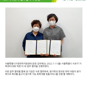게시판 제목내용제목+내용 849 [복지정보] 서울시 미래청년기획단 청년이사비 지원사업 안내 ㅇ 사 업 명 : 2022년 서울시 청년 .. 2022-09-15 848 2022.8월 위탁가정 역량강화 프로그램 진행(아동권리교육/MBTI 교육) 2022-09-08 847 2022년 9월 예비일반위탁부모 양성교육 안내 서울가정위탁지원센터에서는 예비일반위탁부모를 모집, 발굴하고 교육하기 위해.. 2022-09-01 846 서울가정위탁지원센터 임상치료사 육아휴직 대체계약직원 채용 서류합격자 공고 서울가정위탁지원센터에서는 임상심리치료 전문인력 육아휴직대체계약직에 대한 .. 2022-08-18 845 2022.7월 센터 소식 2022-08-17 844 서초구가족센터 시범사업‘원(ONE)스텝, 원(ONE)가정’운영 □ 기 관 명 : 서초구 가족센터□ 소 재 지 : (본부) 서초구 방배로.. 2022-08-08 843 [공고]서울시가정위탁지원센터 임상심리치료 전문인력 육아휴직대체계약직 채용공고 우리 어린이재단 서울특별시가정위탁지원센터에서는 임상심리치료 전문인력 계약.. 2022-08-03 842 [공고]임상심리치료 전문인력 육아휴직대체계약직 면접 합격자 안내 우리센터에서는 2022. 08.02일자 임상심리치료 전문인력 육아휴직 대.. 2022-08-03 841 2022년 8월 예비일반위탁부모 양성교육 안내 서울가정위탁지원센터에서는 예비일반위탁부모를 모집, 발굴하고 교.. 2022-08-01 840 [공고]임상심리치료 전문인력 육아휴직대체계약직 서류전형 합격자 안내 우리센터에서는 임상심리치료 전문인력 육아휴직 대체계약직 서류 전형 합격자.. 2022-07-28 839 서초 가족센터 업무협약식 진행 2022-07-20 838 2022 위탁가정 온라인 보수교육 안내 안녕하세요, 서울가정위탁지원센터입니다.가정위탁지원센터에서는 매년 1회 위.. 2022-07-19 837 2022.6월 센터 소식 2022-07-18 836 초록우산 어린이재단 서울특별시가정위탁지원센터 임상심리치료 전문인력 육아휴직대체계약직 채용공고 어린이재단 서울특별시가정위탁지원센터임상심리치료 전문인력 육아휴직대체계약직.. 2022-07-13 835 서울특별시가정위탁지원센터 임상심리치료 전문인력 육아휴직대체계약직 면접전형 합격자 안내 서울특별시가정위탁지원센터 임상심리치료 전문인력 육아휴직대체계약직 면접전형.. 2022-07-13 834 서울특별시가정위탁지원센터 임상심리치료 전문인력 육아휴직대체계약직 서류전형 합격자 발표 서울가정위탁지원센터에서는 임상심리치료 전문인력 육아휴직대체계약직에 대한 .. 2022-07-08 처음 이전 11페이지 열린12페이지 13페이지 14페이지 15페이지 16페이지 17페이지 18페이지 19페이지 20페이지 다음 맨끝